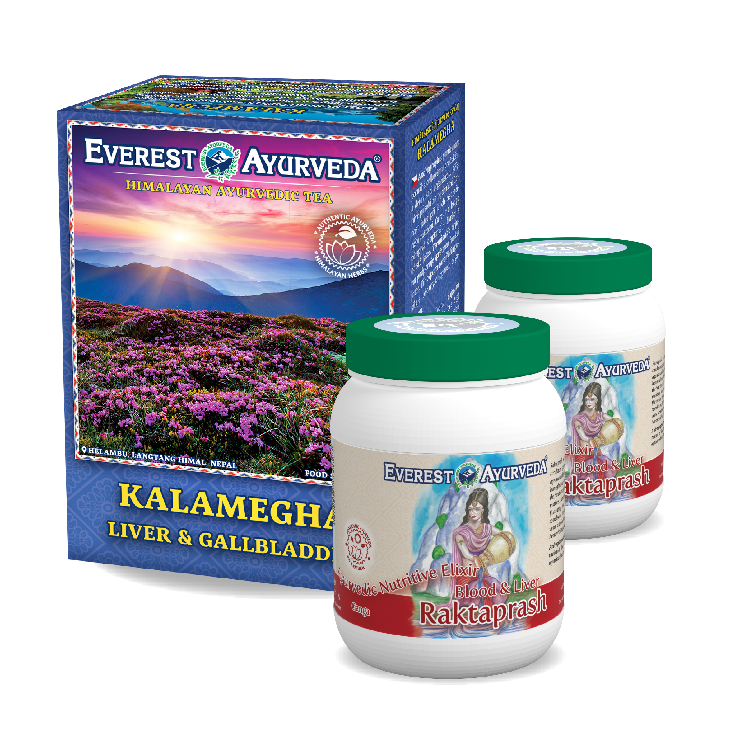 Die Kur besteht aus: 1 × Ayurveda-Tee KALAMEGHA, 2 × Kräuterpaste RAKTAPRASH