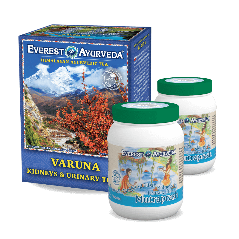 Die Kur besteht aus: 1 × Ayurveda-Tee VARUNA, 2 × Kräuterpaste MUTRAPRASH