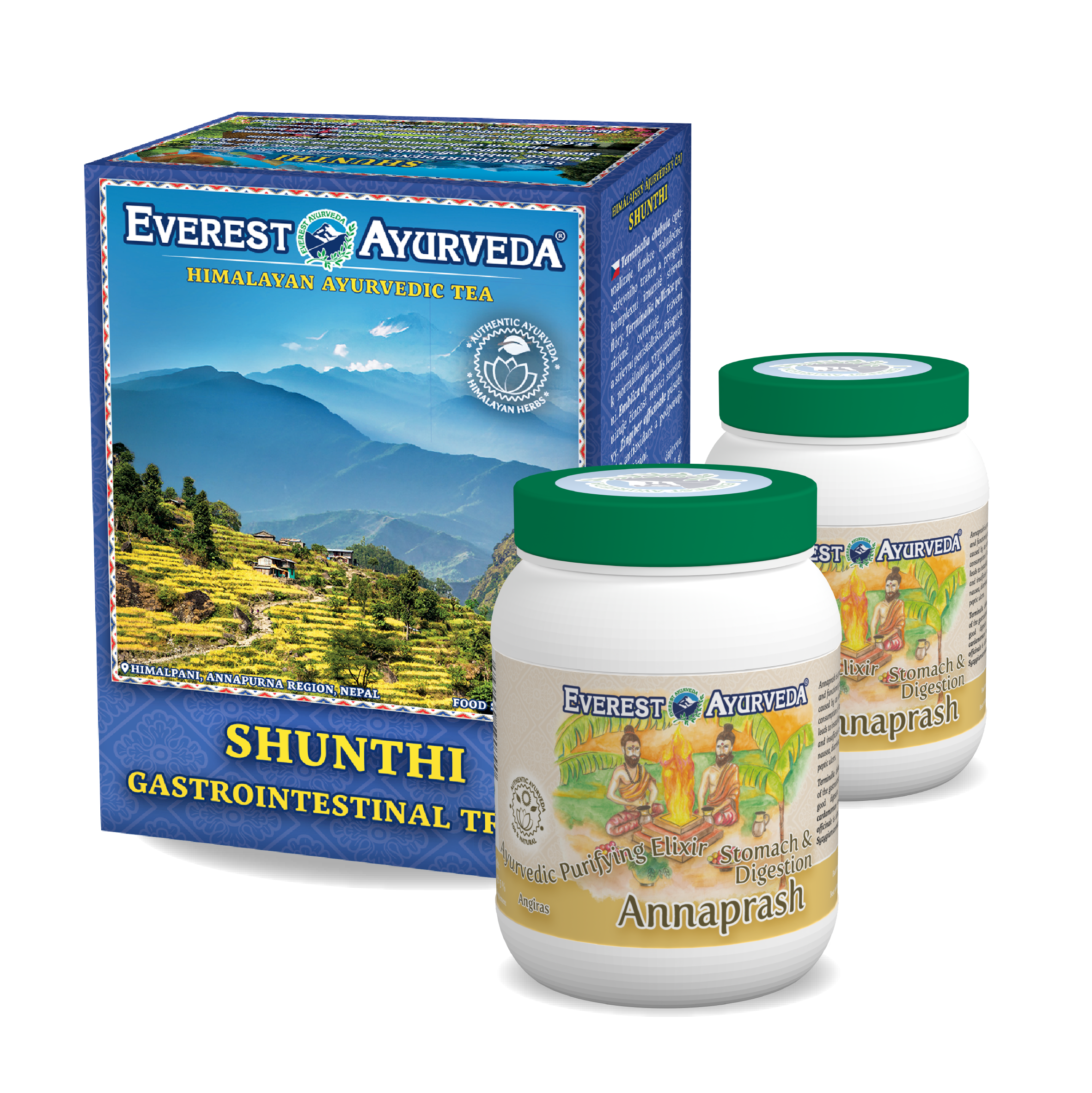 Die Kur besteht aus: 1 × Ayurveda-Tee SHUNTHI, 2 × Kräuterpaste ANNAPRASH